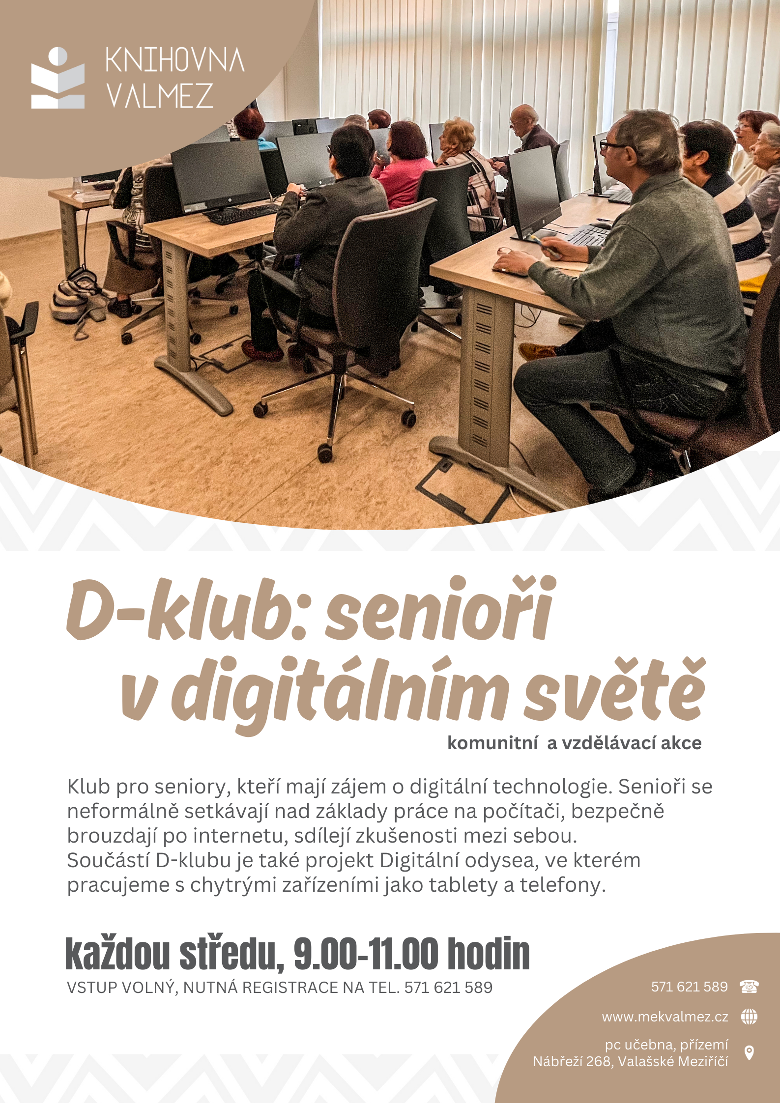 Knihovna • D-klub• 9:00-11:00 • dopoledne pro seniory, individuální poradenství – jak na počítač či telefon.